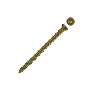 Шуруп имеет острый наконечник, переменную резьбу по всему стержню, плоскую потайную головку с насечками на внутренней стороне, препятствующими самопроизвольному выкручиванию. Шлиц - TORX 30. Не подвержен коррозии.